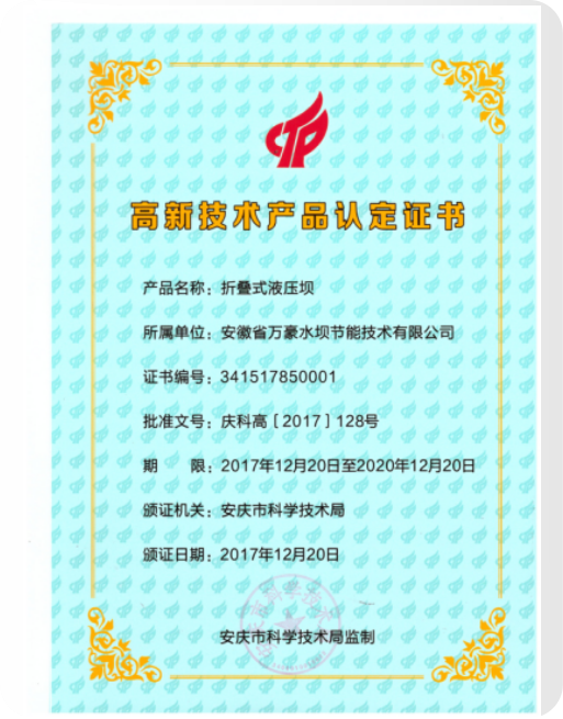 液壓升降壩專利證書