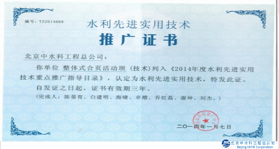 合頁活動壩專利證書